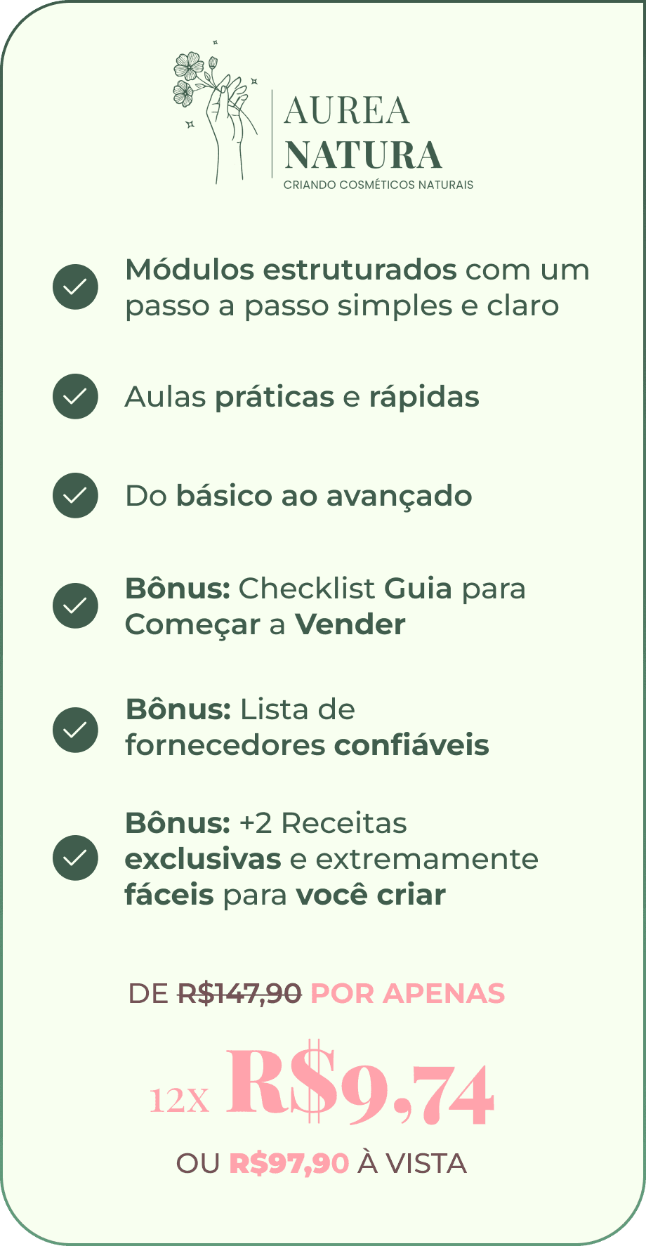 Agora, com o Curso AureaNatura, eu vou te ensinar a criar cosméticos 100% naturais, de forma simples e prática. Além de cuidar da sua saúde e do meio ambiente, você poderá transformar essa habilidade em um negócio lucrativo e cheio de propósito.